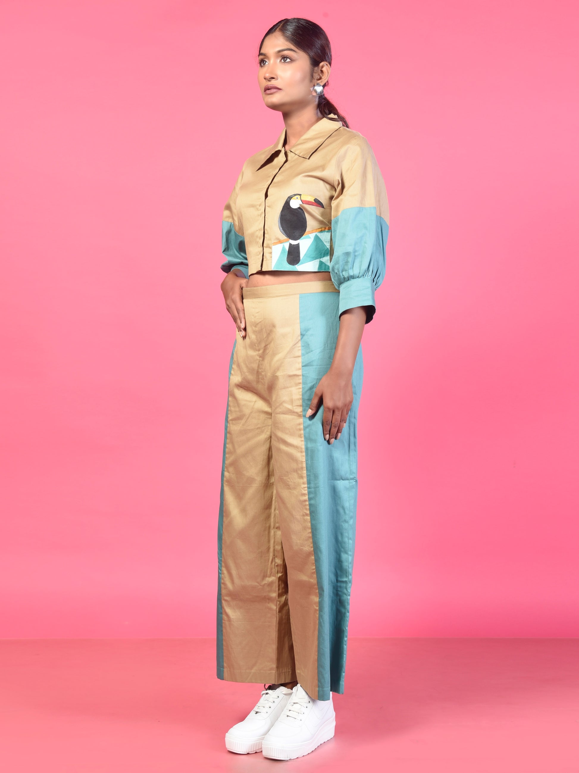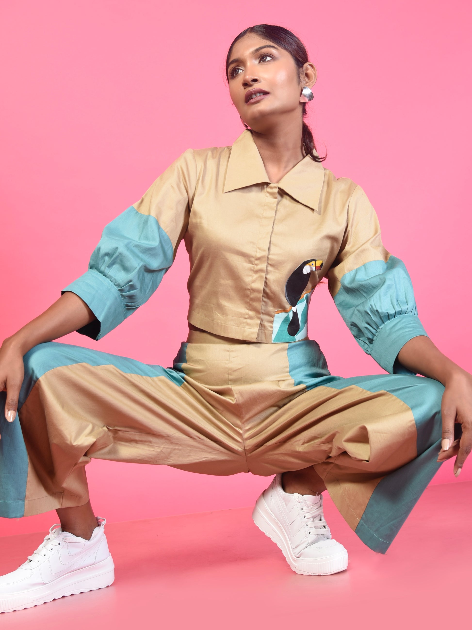 Step into vacation mode with the Tropical Ease Set. Crafted from a lightweight, breezy fabric, this two-piece ensemble features a cropped top with a playful abstract motif, paired with a high-waist pant in contrasting tan and turquoise. Finished with front opening and sporty vibes, it’s the perfect fusion of casual cool and island flair.