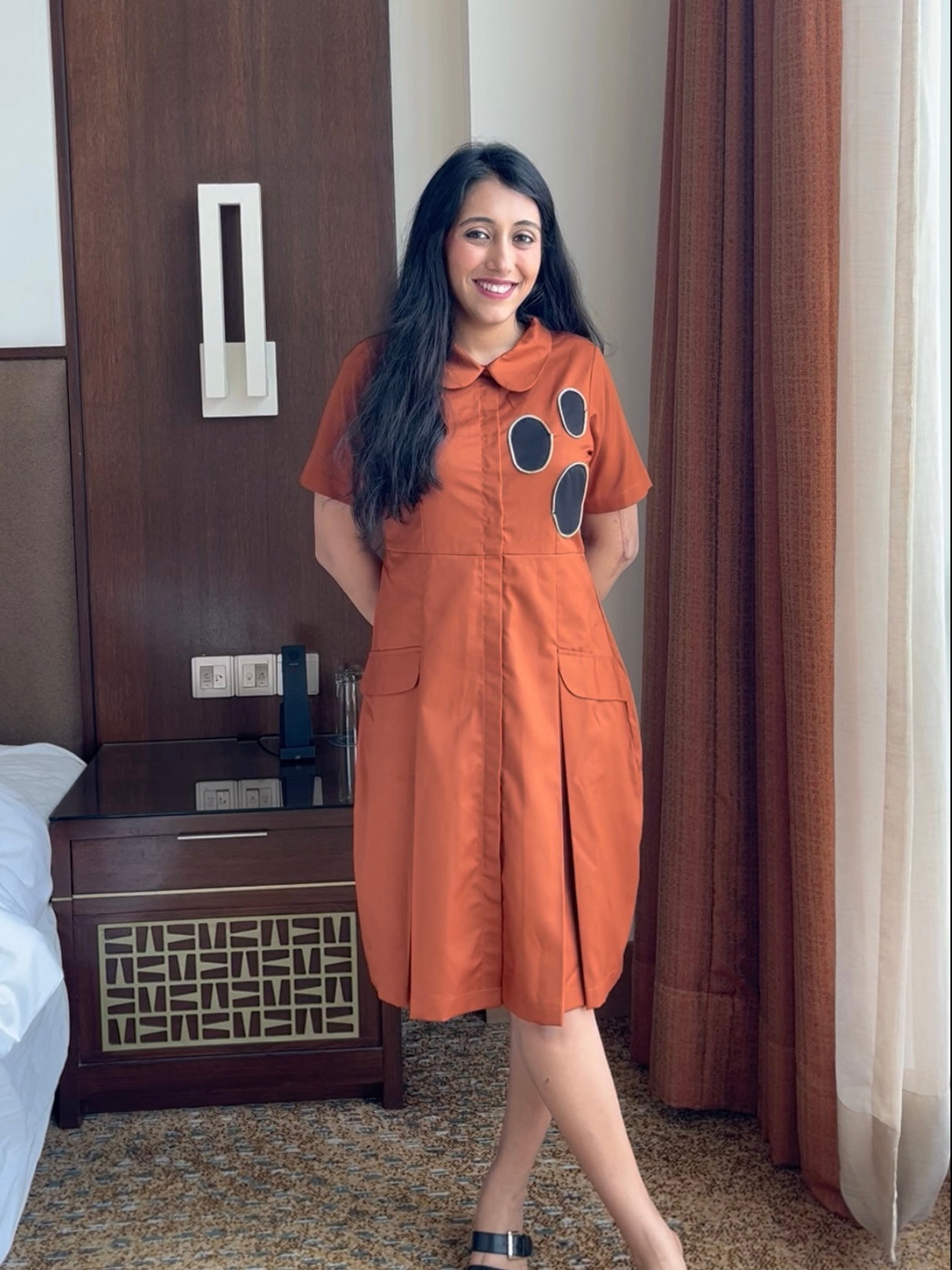 Step into modern elegance with our Rust Orbit Midi Dress. Crafted in a warm rust-brown hue, this structured silhouette features a sharp collared neckline, short sleeves, and a flattering midi length that moves effortlessly from day to evening. Unique black circular appliqués on the bodice add a bold, contemporary twist, while angled flap pockets enhance the design with functionality and style.