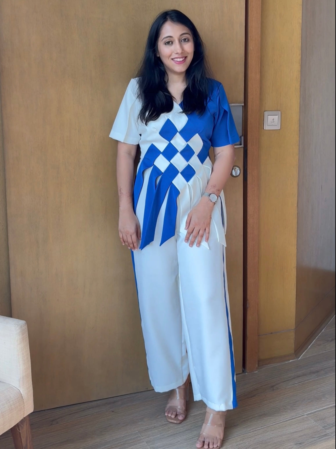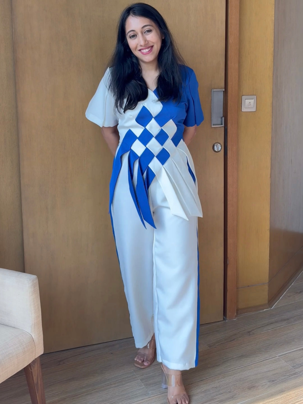 Make a statement in the Diamond Check Co-ord Set, featuring a bold geometric pattern in white and royal blue. With a dramatic panel cascading from the top and wide-legged trousers to match, this set is a conversation starter for fashion-forward days