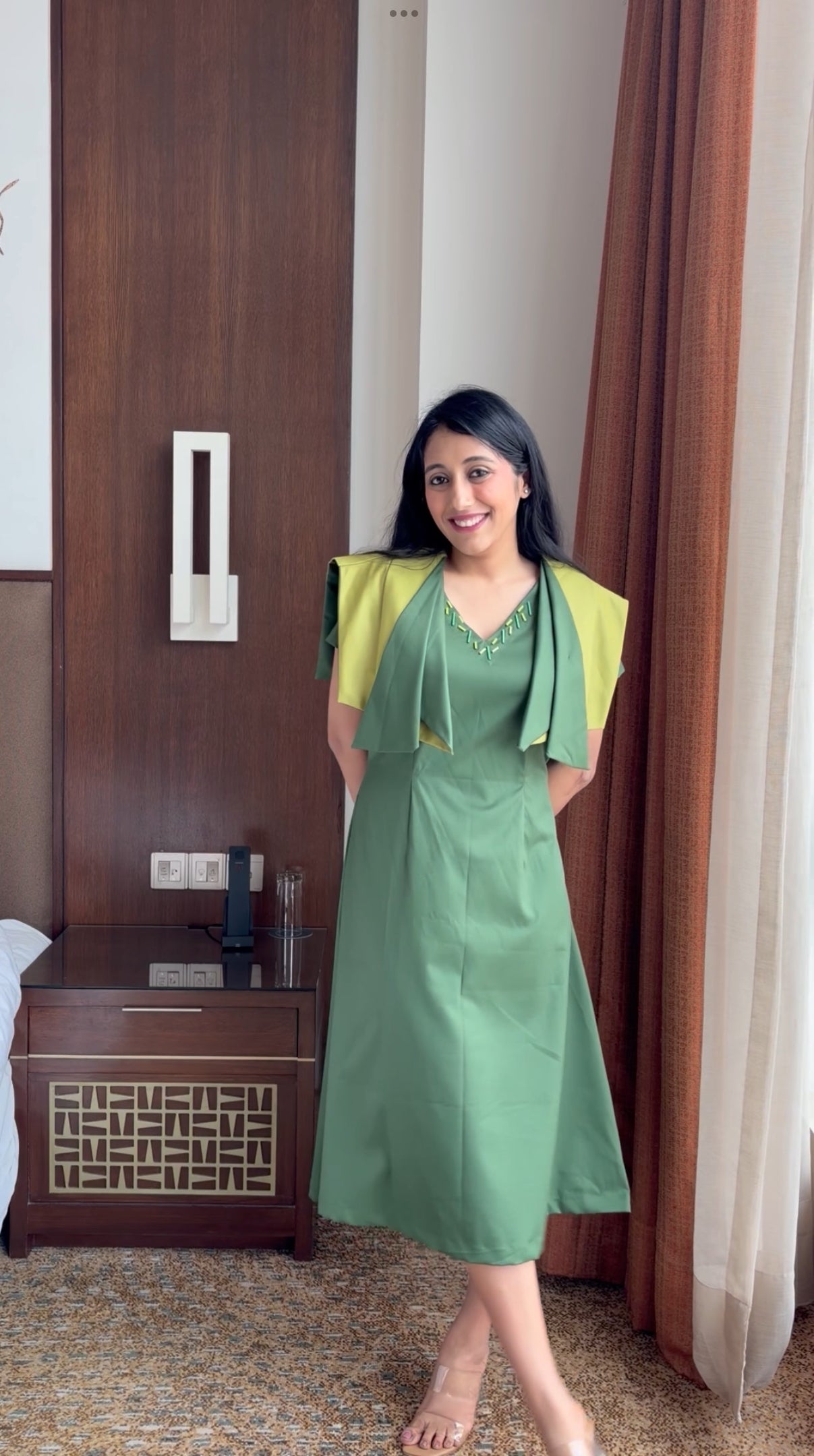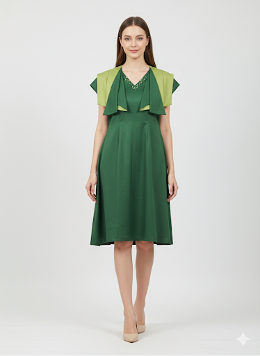 Graceful, refreshing, and ultra-feminine. This A-line midi dress blends deep emerald tones with a soft lime overlay, creating a unique layered neckline that sets it apart. Designed with a flowy fit that flatters all body types, this piece brings effortless charm to daytime outings, brunches, and semi-formal occasions. Light, breezy, and beautifully structured.