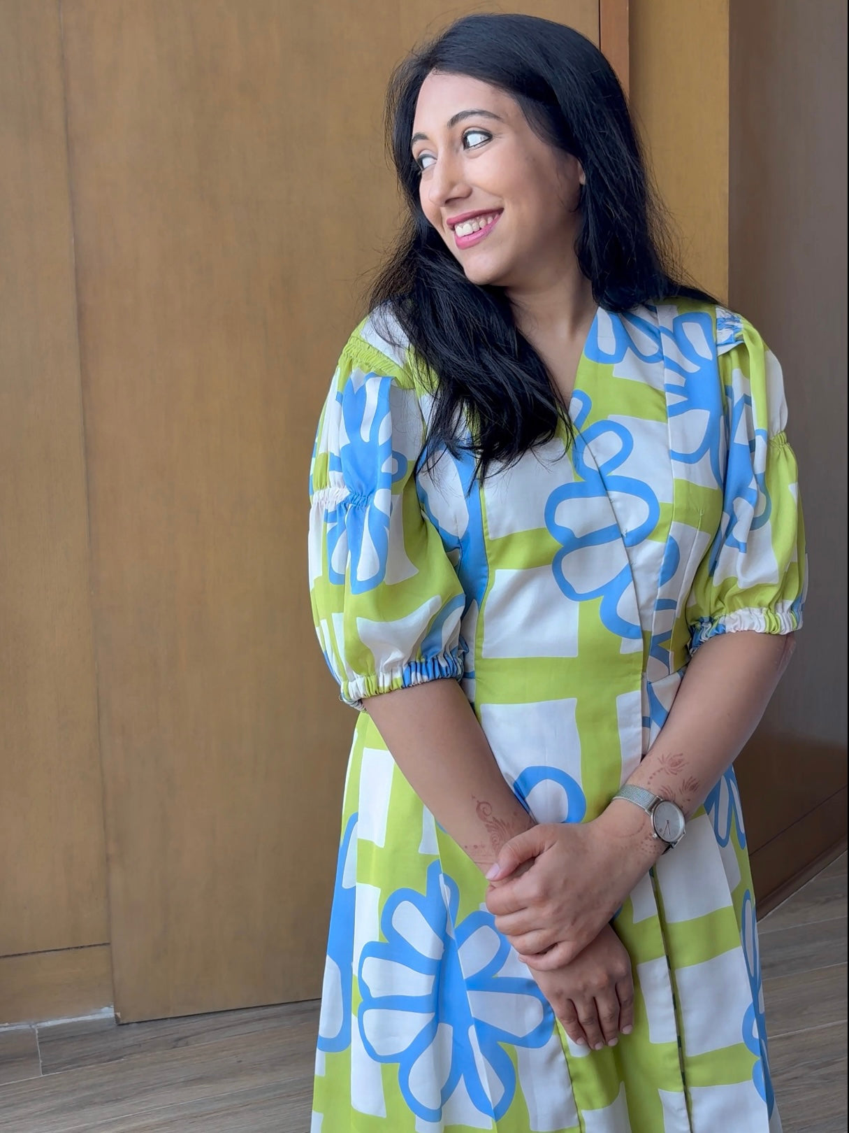 Bright, breezy, and playful — the Pastel Waves Dress features an all-over large floral print in lime and sky blue. Crafted in a soft, flared silhouette with puffed sleeves, it’s made for sunny days, vacations, and every moment in between.