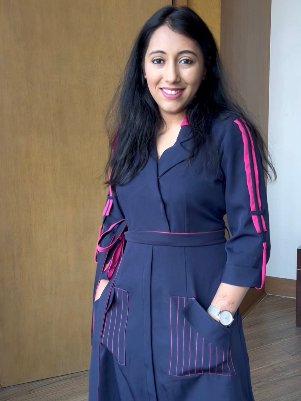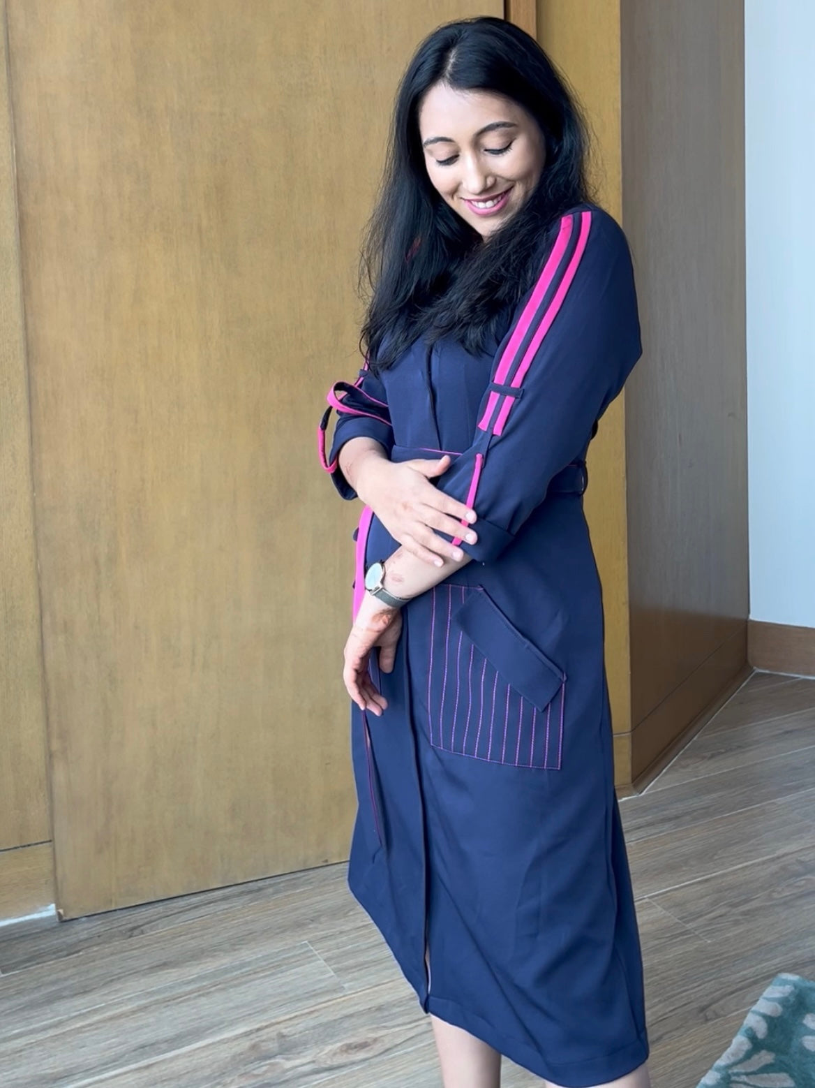 The Blush Ink Dress is a tailored staple with a sporty twist. With a double collared neckline, roll-up sleeves, and fuchsia stripe detailing on the arms and pockets, it brings personality to professional wear. Finished with a cinched tie-waist belt for shape and comfort