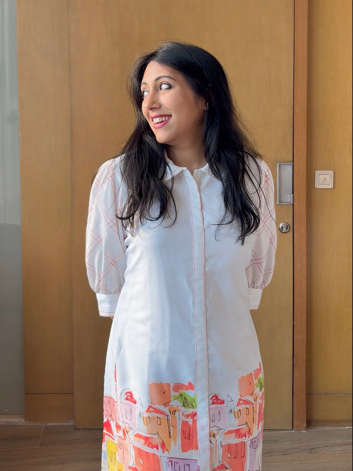 • Shirt dress silhouette with collar• Unique building/landscape-inspired border print